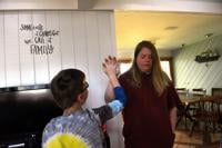 Abbey Clegg of Manchester high-fives her son Teyson after he arrives home from school.